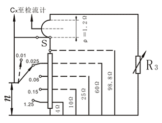 为了扩大可测得被试品电容值范围,也就是扩大允许的试品电流İX的范围,在电阻R3旁并联可分档调节的分流电阻,可使最大可测试品电容由3000pF扩大到0.4μF,如图1-2所示。