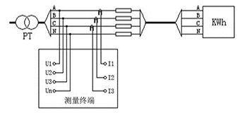 在PT侧进行测试。PT侧A、B、C相电压线分别接到测量终端的U1、Un、U3端子上;用A、C(分别接到测量终端的I1,I3上)两把钳形电流互感器分别接到PT侧A、C相上,注意:相别一定要对应,否则测试结果不正确。