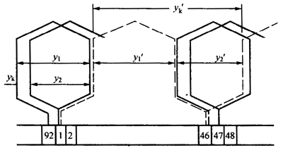 有一台直流电机,其电枢绕组由蛙式绕组构成,其参数为:槽数Z=46;换向片数K=92,叠绕组部分的换向片节距yk=1;第一节距Y1=22,第二节距y2=21;波绕组部分的换向片节距yk=45,第一节距为y'1=24,第二节距y'2=21,具体接线如图1-5所示。