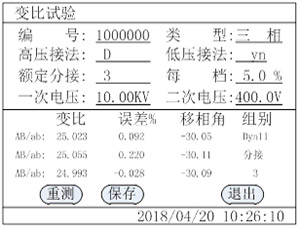 高压和低压接法:当选择三相变压器时会出现该选择项,该项只作为显示和打印组别的辅助项,不影响测试结果。